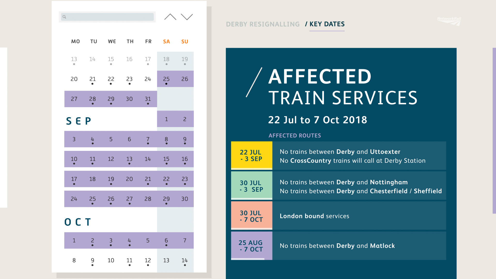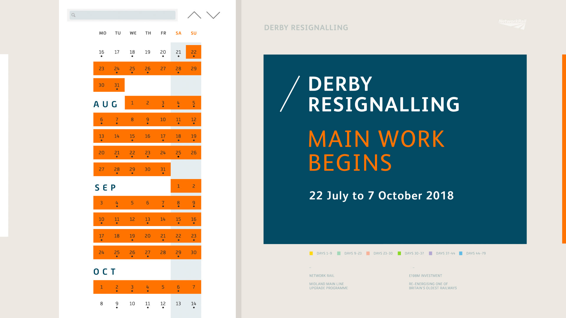Network Rail directly approached DW Studio to create an in-depth CGI video to communicate the upcoming £200 million re-signalling of Derby Station. The brief was to design an engaging but informative video that detailed the 79 days of activity, along with the benefits to those living in the area and using Derby station services. The video had to inform people of the project scale, the key milestones and resulting train disruptions, whilst giving stakeholders an update on project information. DW Studio developed a video structure and format that allowed Network Rail's construction work to be showcased across varying locations, across different timescales. These bite-sized scenes helped to keep the five minute video engaging and hold the attention of those viewing the video. The entire existing Derby station and future alterations were modelled in-house using 2d plans. A bespoke user-interface style calendar system was designed in-house to communicate a magnitude of information, dates and processes required to deliver the Derby Re-signalling programme.